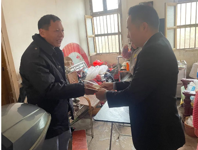 新年將至,歲寒情暖。在2024年新春佳節(jié)即將來臨之際,海龍化工到文福鎮(zhèn)暗石村開展愛心慰問暖冬行動。海龍化工工會主席余佛龍與暗石村委會丘遠忠書記等村委干部一同走訪慰問了3戶貧困學生和困難戶,向他們發(fā)放慰問金及米、油等物資,并對他們致以誠摯的慰問和新春祝福,讓他們溫暖過冬,溫馨過節(jié)。