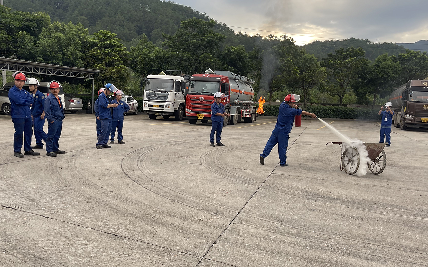 演練人員由10米外持滅火器奔向火場進行滅火,由上風向接近著火點,站在上風處1.5米—2米處用干粉滅火器撲救初起火災。人員排隊依次進行滅火實操演練。