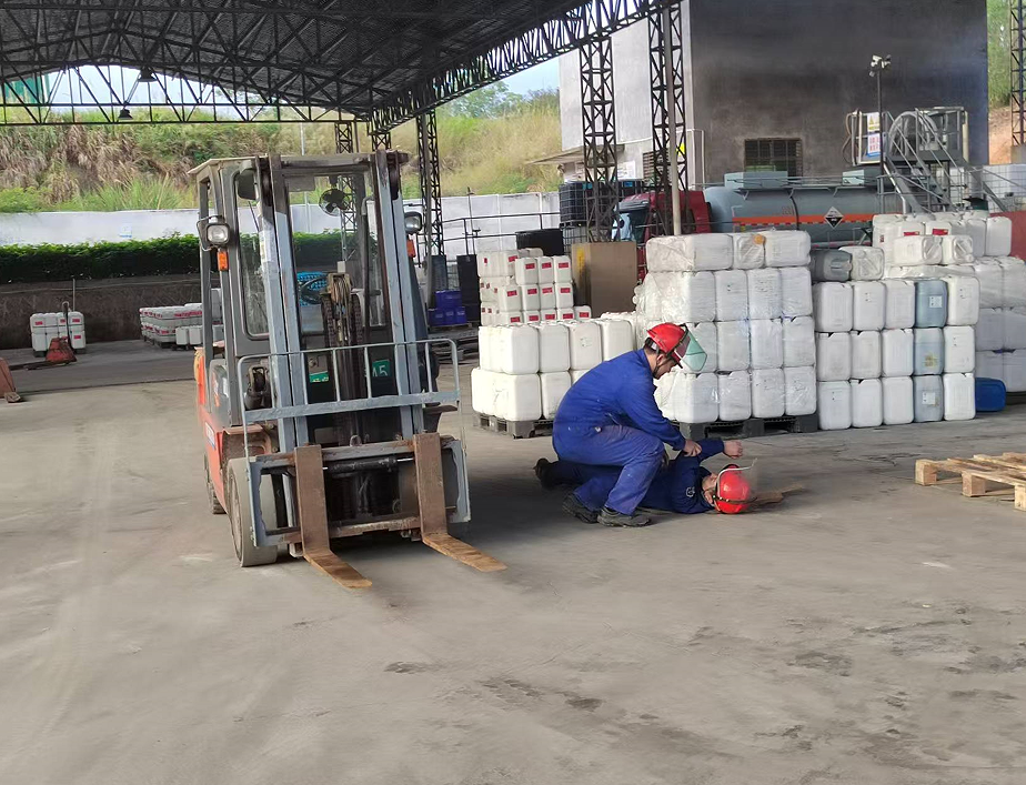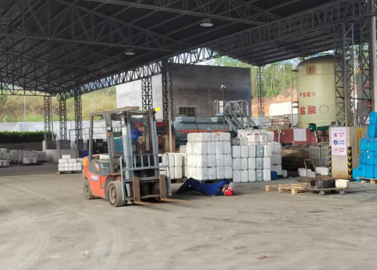模擬三酸車間叉車司機王根滿載貨物時,由于未注意周邊情況,撞到正在盤貨人員傅偉航。