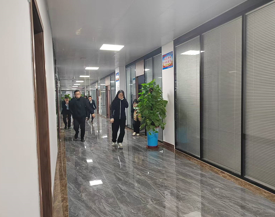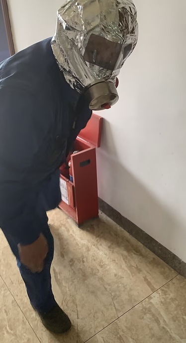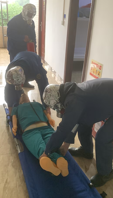 模擬接待室電器過載突然起火并點燃周邊紙張,火勢發(fā)展迅猛并產(chǎn)生大量濃煙,保潔員發(fā)現(xiàn)后大喊“著火了,著火了”,并且拉響消防警報,接報后,相關(guān)人員使用滅火器撲救火災(zāi),并通知每間辦公室人員緊急撤離至安全地帶,最后進行人員清點。